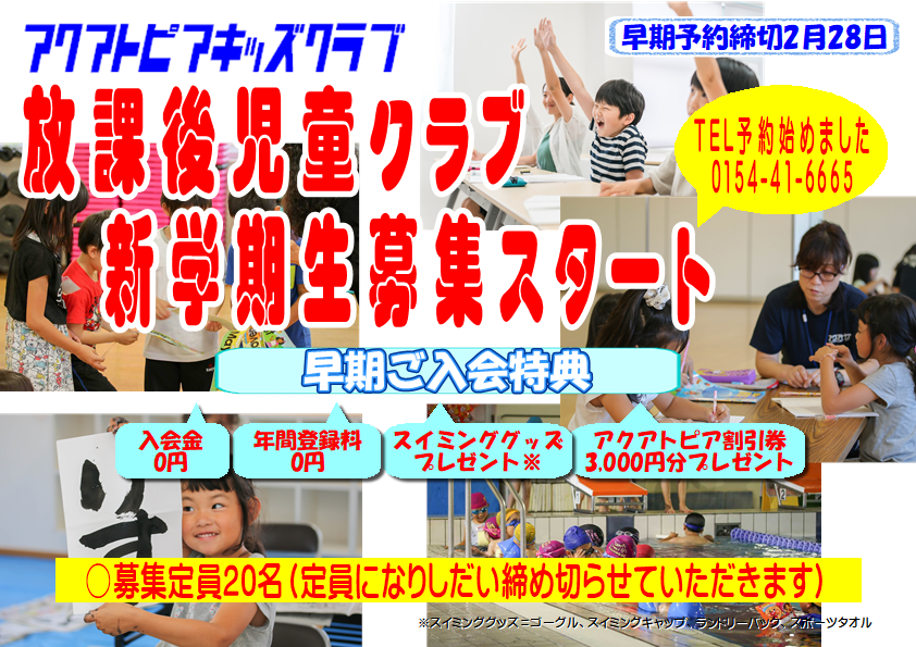 お知らせ , お得情報 キッズクラブ(放課後児童クラブ)新学期生予約開始 2026.01.15 お知らせ , お得情報 キッズクラブ新学期生(4月スタート)予約受付けしています。 定員20名、2月28日まで申し込むと早期入会特典があります。 Tweet Share 記事のタイトルとURLをコピーする キッズクラブ(放課後児童クラブ)新学期生予約開始 前の記事 新着のお知らせ キッズクラブ(放課後児童クラブ)新学期生予約開始 2026.01.15 あけましておめでとうございます 2026.01.06 1月レッスン表 月~木 2025.12.25